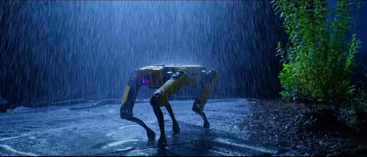 Six months later, a bomb went off in the middle of an assembly, killing 200 and injuring more. Police robot dogs were brought back, their yellow coats over painted with the people’s red.